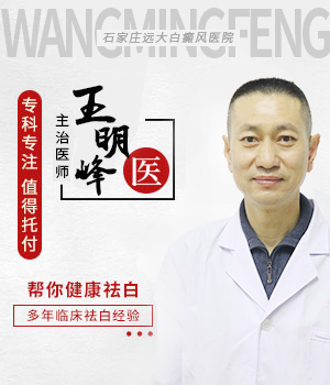 王明峰主任毕业于河北医科大学,从事皮肤病临床诊疗工作多年,曾进修于北京大学人民医院、北京协和医院皮肤科,具有扎实的中西医学理论知识和丰富的白癜风临床诊疗经验;深入研究白癜风等白斑病的病因及病理,并应用中西医结合辨证诊治不同类型的白癜风,并让众多患者摆脱白斑困扰,深受广大患者赞誉。